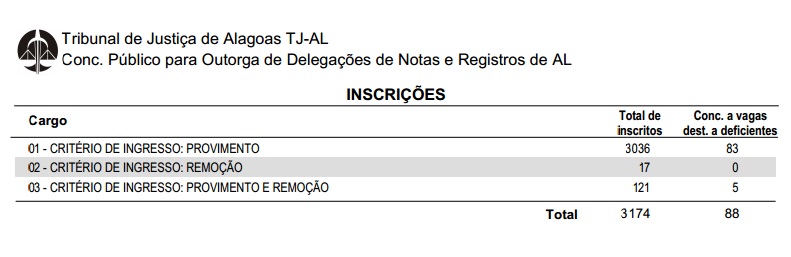 O Tribunal de Justiça de Alagoas divulgou na tarde desta sexta-feira (6) o número de inscritos no Concurso Público para Outorga de Delegações de Notas e Registros de Alagoas. Segue abaixo: