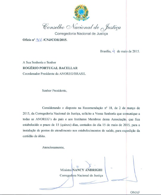 Ofício CNJ/COR Nº 366/2015 – Estabelece prazo para instalação de postos de atendimento nos estabelecimentos de saúde para emissão de óbito