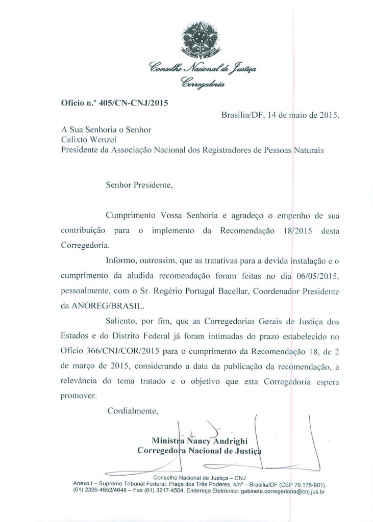 Ministra Nancy Andrighi responde ofício da Arpen-Brasil sobre Recomendação nº 18 do CNJ