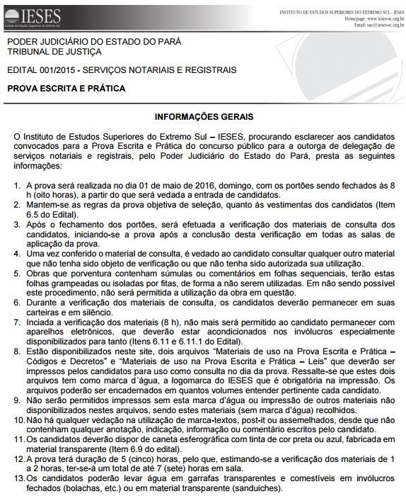 Segundo a organizadora, estão disponibilizados neste site dois arquivos Materiais de uso na Prova Escrita e Prática – Códigos e Decretos e Materiais de uso na Prova Escrita e Prática – Leis, que deverão ser impressos pelos candidatos para uso como consulta no dia da prova. “Ressalte-se que estes dois arquivos tem como marca d´água, a logomarca do Ieses que é obrigatória na impressão. Os arquivos poderão ser encadernados em quantos volumes entender pertinente cada candidato. Não serão permitidos impressos sem esta marca d’água ou impressão de outros materiais não disponibilizados nestes arquivos, sendo estes materiais (sem marca d’água) recolhidos”, consta no documento.