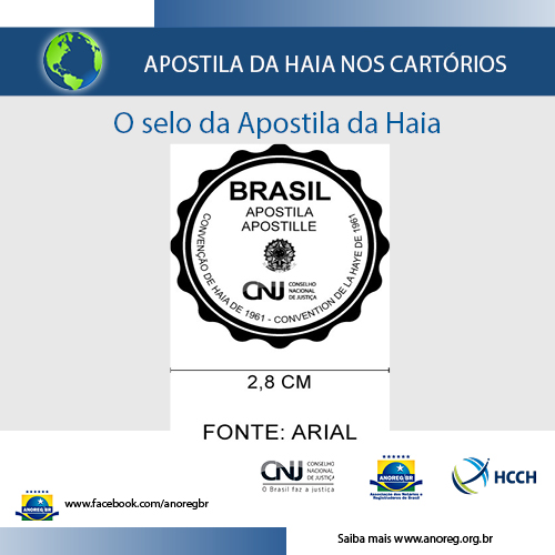 O layout oficial do selo segue determinações internacionais e deverá estar de acordo com a Resolução nº 288/2016 do CNJ, devendo medir 2,8 cm com fonte Arial, conforme manual disponível no site do CNJ http://goo.gl/hFf6ry – versões em pdf ou jpg.