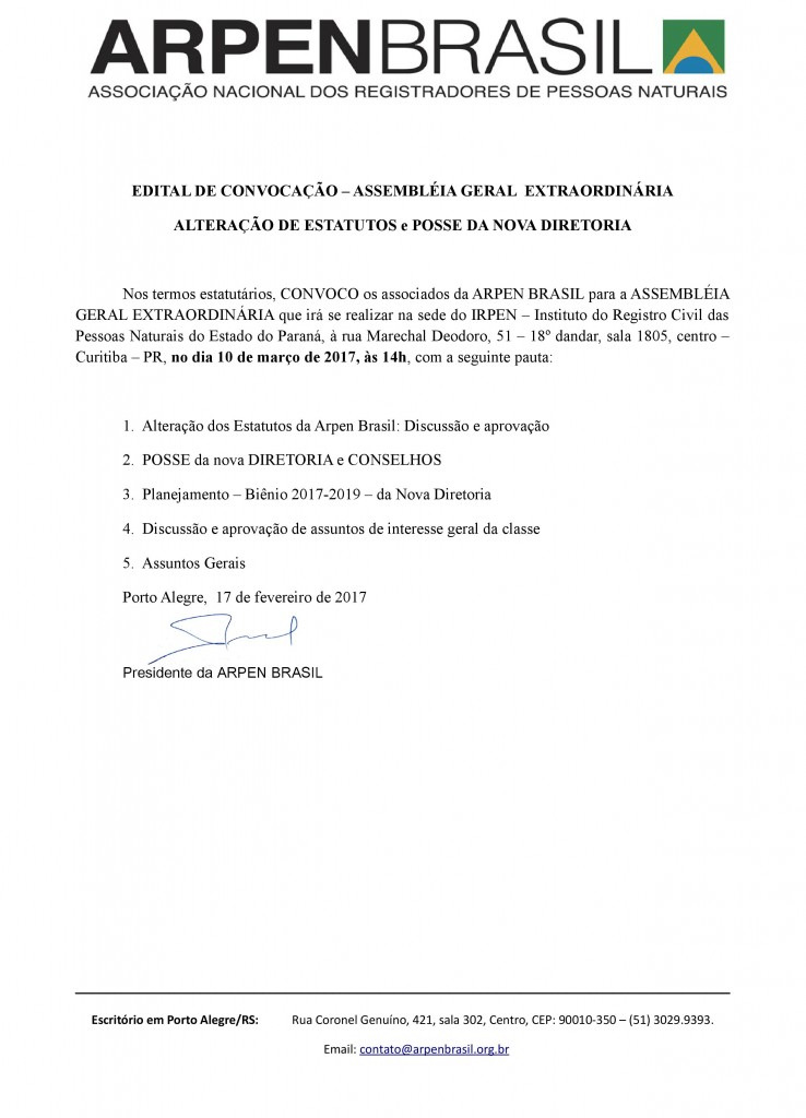 Arpen-BR publica edital de convocação para Assembleia Geral e posse da nova diretoria no dia 10 de março na sede do Irpen-PR