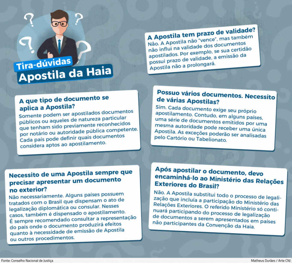 Antes da Convenção da Apostila da Haia, era preciso ir ao Ministério das Relações Exteriores (MRE) ou a escritórios regionais do órgão para legalizar um documento, realizar a tradução e encaminhá-lo à autoridade consular do país onde seria utilizado. Atualmente, é feita uma legalização única. A pessoa procura um cartório habilitado em uma das capitais estaduais ou no Distrito Federal e solicita a emissão de uma Apostila para um documento.