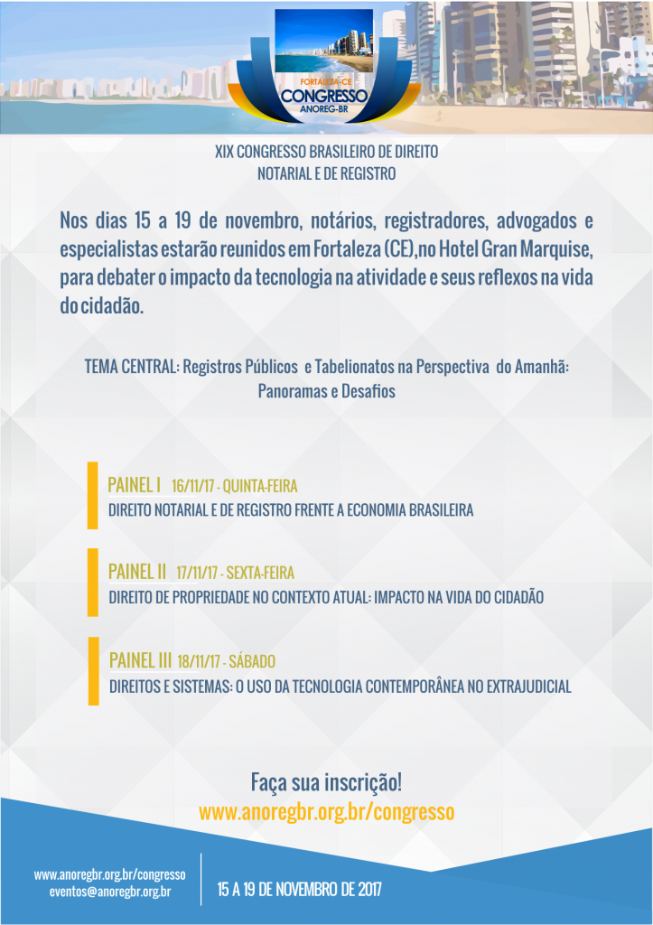 Já estão abertas as inscrições para o XIX Congresso Brasileiro de Direito Notarial e de Registro, evento anual que reúne notários, registradores, especialistas, juristas, advogados e estudantes brasileiros e que neste ano será realizado entre os dias 15 e 19 de novembro, no Hotel Gran Marquise, em Fortaleza, no Ceará. As inscrições estão abertas pelo site oficial:http://www.anoreg.org.br/congresso2017.