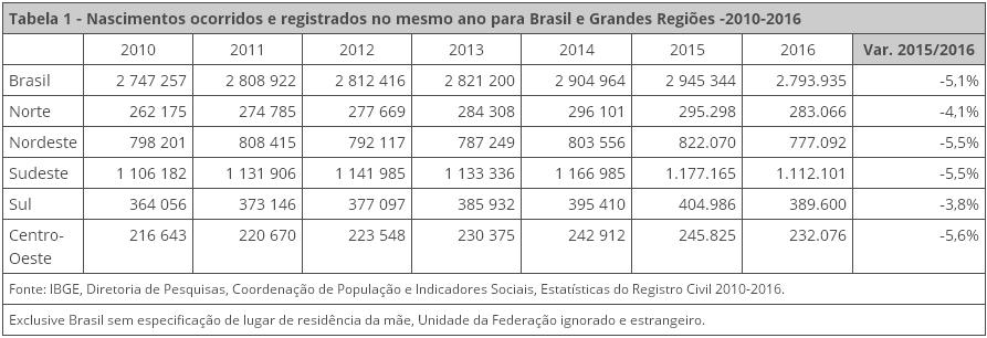 Pela primeira vez desde 2010, foi verificada uma queda no total de registros de nascimentos do país e em todas as Grandes Regiões. Na comparação com 2015, o Brasil apresentou uma redução média de -5,1% no total de nascimentos. A região com menor queda foi a Sul com -3,8% e o Centro-Oeste, com maior queda, -5,6%.