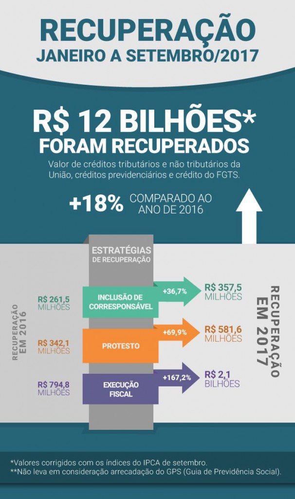 Levando em consideração o período de janeiro a setembro, foram recuperados pouco mais de R$ 12 bilhões — valores referentes aos créditos tributários e não tributários da União, previdenciários e de FGTS —, que representam 18% de crescimento real comparado aos R$ 10,2 bilhões de 2016.