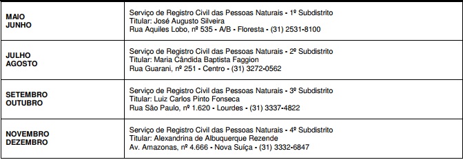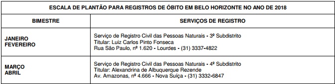 Divulga a escala de plantão bimestral, a vigorar no ano de 2018, para os registros de óbito que ocorrerem em Belo Horizonte, aos sábados, domingos e feriados, no horário de 09 as 12 horas e de 13 as 17 horas.