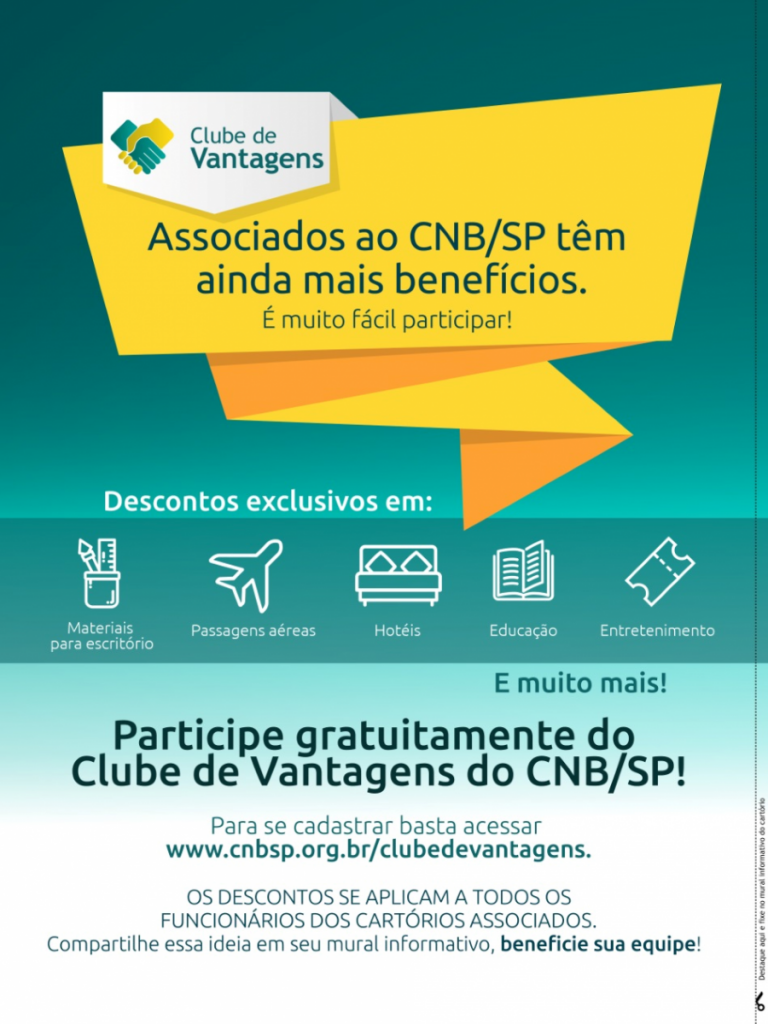Para desfrutar dos descontos e benefícios, cadastre-se agora por meio do link https://goo.gl/sVka31. Esse cadastro pode ser realizado por qualquer membro da equipe do tabelionato associado ao CNB/SP.