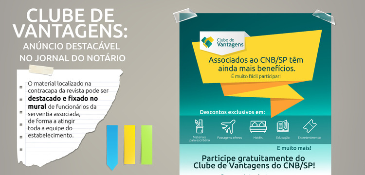 O Colégio Notarial do Brasil – Seção São Paulo (CNB/SP) disponibiliza anúncio destacável sobre o Clube de Vantagens em nova edição do Jornal do Notário. O material localizado na contracapa da revista pode ser destacado e fixado no mural de funcionários da serventia associada, de forma a atingir toda a equipe do estabelecimento. Veja abaixo: