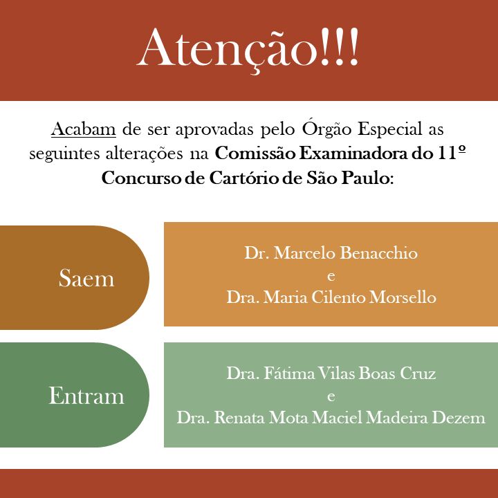 Acaba de ser aprovada pelo Órgão Especial do TJSP a saída do dr. Marcelo Benacchio e da dra. Daniela Maria Cilento Morsello da Banca avaliadora do 11º Concurso de Outorga de Delegações de São Paulo.
