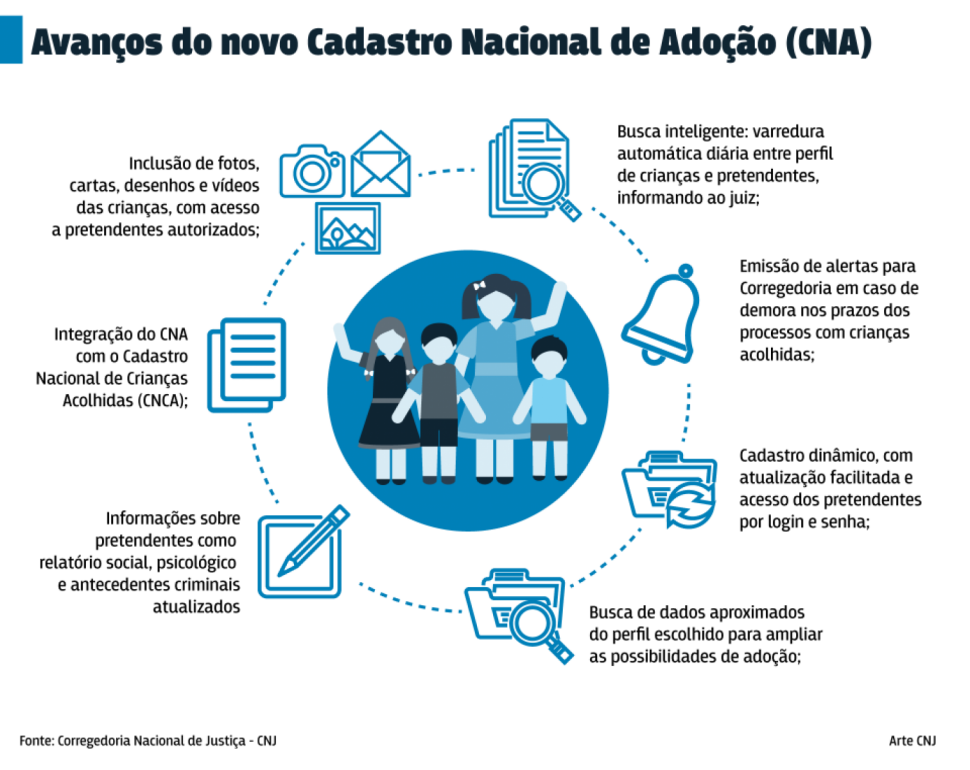 O que todos têm em comum é a articulação do cadastro de adoção com o cadastro de crianças em situação de acolhimento institucional: a integração entre esses dois sistemas é uma das principais novidades do novo CNA. Outra mudança é a possibilidade de incluir fotos, vídeos, cartas, desenhos e outros documentos das crianças disponíveis para adoção.