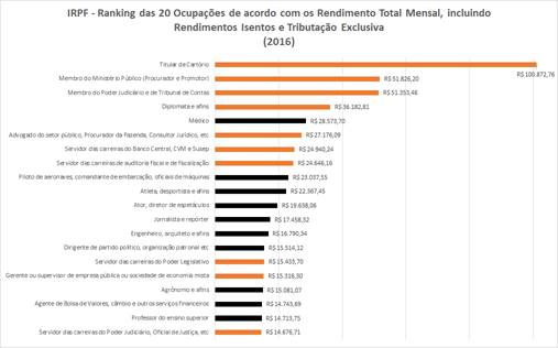 Reproduzo abaixo o ranking, atualizando-o com os últimos dados disponíveis (2016) e expandindo a lista para as 20 categorias com maior rendimento: