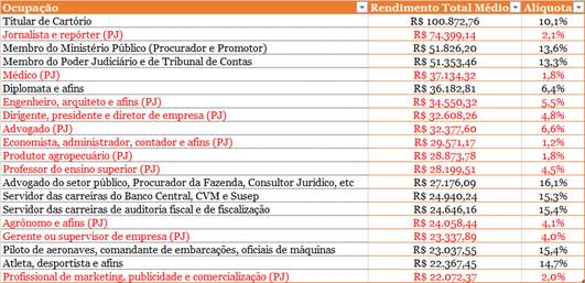 Desde a semana passada uma tabela apareceu recorrentemente na “timeline” das minhas redes sociais, compartilhada tanto por amigos de direita quanto por esquerdistas. Tratava-se da compilação de um documento da Receita Federal contendo as quinze ocupações com maiores rendas médias anuais de acordo com a declaração de Imposto de Renda Pessoa Física de 2013.