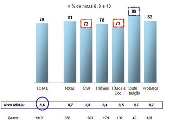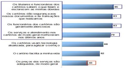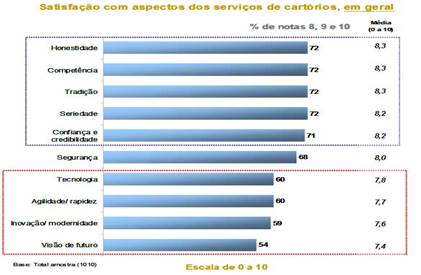 De modo geral, os cartórios são muito bem avaliados, sobretudo no que diz respeito à honestidade, competência, seriedade, confiabilidade e credibilidade.
