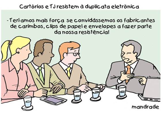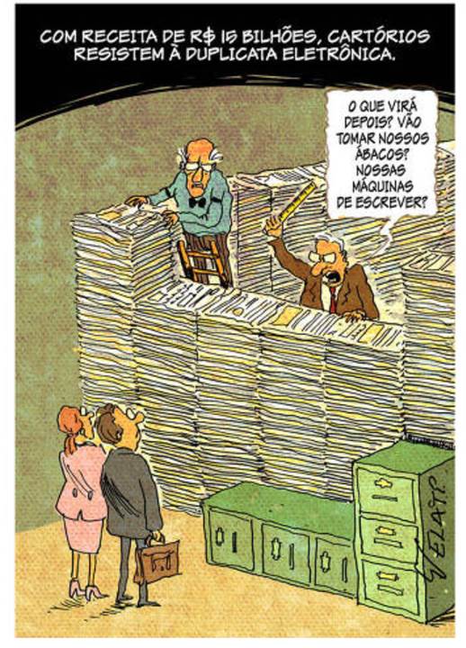 Uma pequena descrição do desenho: Abaixo de um título em destaque (Com receita de R$15 Bilhões, Cartórios Resistem à Duplicata Eletrônica), entrincheirados entre uma montanha de papéis, dois senhores reclamam paras seus interlocutores: ” O que virá depois? Vão tomar nossos Ábacos? Nossas Máquinas de Escrever?… “