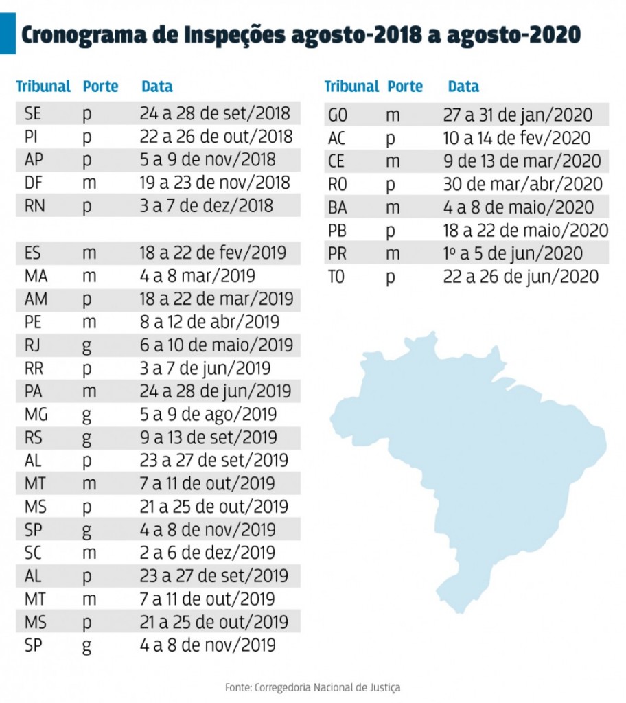 De acordo com o cronograma apresentado, serão realizadas, no máximo, duas inspeções por mês e a duração da visita da corregedoria não ultrapassará cinco dias. O primeiro tribunal a receber inspeção será o Tribunal de Justiça de Sergipe, no período de 24 a 28 de setembro. Em seguida, será a vez do Tribunal de Justiça do Piauí, de 22 a 26 de outubro.