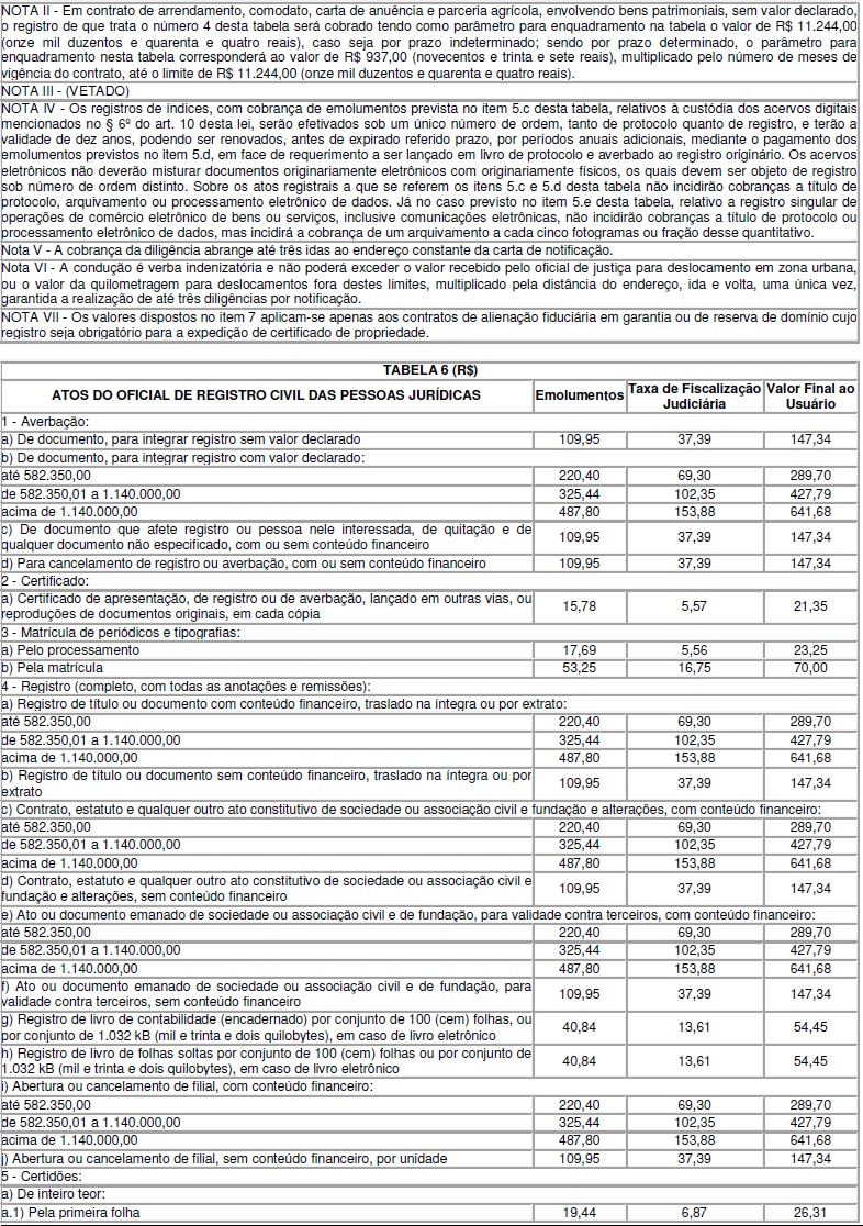 Atualiza, para o exercício de 2020, as tabelas que integram o Anexo da Lei estadual nº 15.424, de 30 de dezembro de 2004, que “dispõe sobre a fixação, a contagem, a cobrança e o pagamento de emolumentos relativos aos atos praticados pelos serviços notariais e de registro, o recolhimento da Taxa de Fiscalização Judiciária e a compensação dos atos sujeitos à gratuidade estabelecida em lei federal e dá outras providências”.