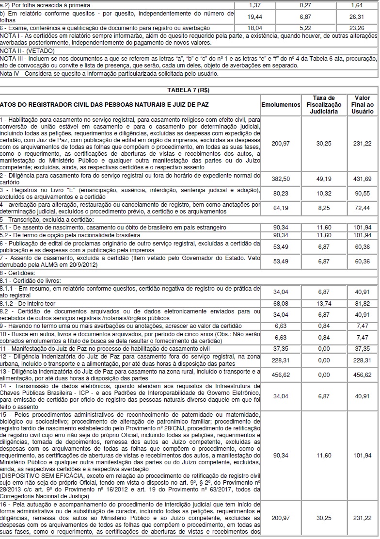 CONSIDERANDO que o caput do art. 50 da Lei estadual nº 15.424, de 2004, delega competência administrativa à Corregedoria-Geral de Justiça – CGJ para a publicação das tabelas que integram o seu Anexo, ao estabelecer que os respectivos “valores […] serão atualizados anualmente pela variação da Unidade Fiscal do Estado de Minas Gerais – UFEMG, prevista no art. 224 da Lei nº 6.763, de 26 de dezembro de 1975, devendo a Corregedoria-Geral de Justiça – CGJ – publicar as respectivas tabelas sempre que ocorrerem alterações”;