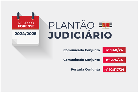 2º Grau – Nos termos do Comunicado Conjunto nº 274/24 e da Portaria Conjunta nº 10.517/24, será admitido peticionamento eletrônico das 9 às 12 horas, com a utilização obrigatória do assunto 50295 – Plantão Judicial – 2º Grau, para a Seção competente. Petições protocoladas fora de horário serão cadastradas, distribuídas e encaminhadas ao órgão competente somente a partir de 7 de janeiro. Os referidos normativos detalham outras informações importantes sobre o funcionamento do plantão de 2º Grau. Confira a íntegra do comunicado e da portaria.
