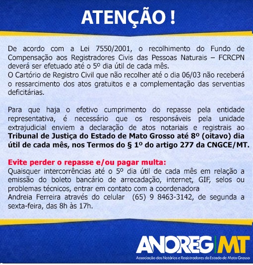 A Associação dos Notários e Registradores do Estado de Mato Grosso (Anoreg-MT) informa que os registradores civis das pessoas naturais têm até o dia 6 de março para efetuarem o recolhimento do Fundo de Compensação. O Cartório de Registro Civil que não recolher até a data indicada não receberá o ressarcimento dos atos gratuitos e a complementação das serventias deficitárias.