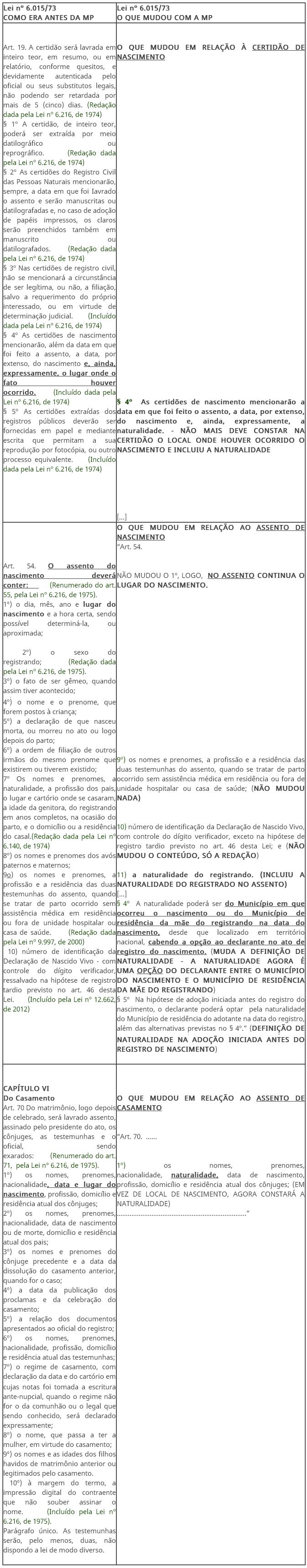 A) O QUE MUDOU EM RELAÇÃO À CERTIDÃO DE NASCIMENTO: Conforme a MP, não mais constará da certidão de nascimento o local de nascimento, mas apenas a menção à naturalidade: art. 19, §4º – “As certidões de nascimento mencionarão a data em que foi feito o assento, a data, por extenso, do nascimento e, ainda, expressamente, a naturalidade.” (grifamos)