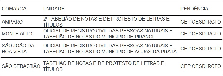 A Corregedoria Geral da Justiça determina aos Senhores Responsáveis pelas Unidades a seguir descritas, que prestem as informações devidas junto à Central Notarial de Serviços Eletrônicos Compartilhados – CENSEC, no prazo de 24 (vinte e quatro) horas, sob pena de falta grave: