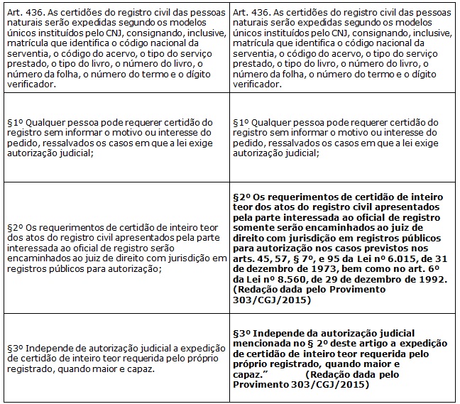 Para melhor visualização da alteração no art. 436 do Provimento 260/CGJ/2013, veja o quadro comparativo abaixo: